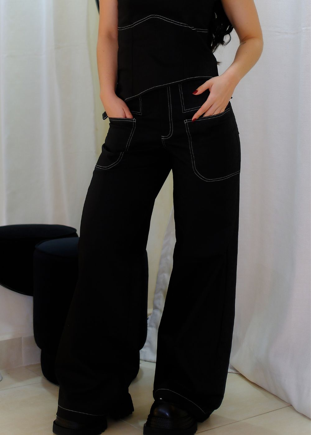 Confeccionado en dril estructurado con estética urbana, de tiro medio y silueta de bota media-ancha, logra una caída definida que estiliza sin esfuerzo. Los bolsillos funcionales y las costuras marcadas le aportan ese toque cool que lo convierte en protagonista. Una pieza con carácter, versátil y fácil de elevar en cualquier look, especialmente con nuestro Rise Top.